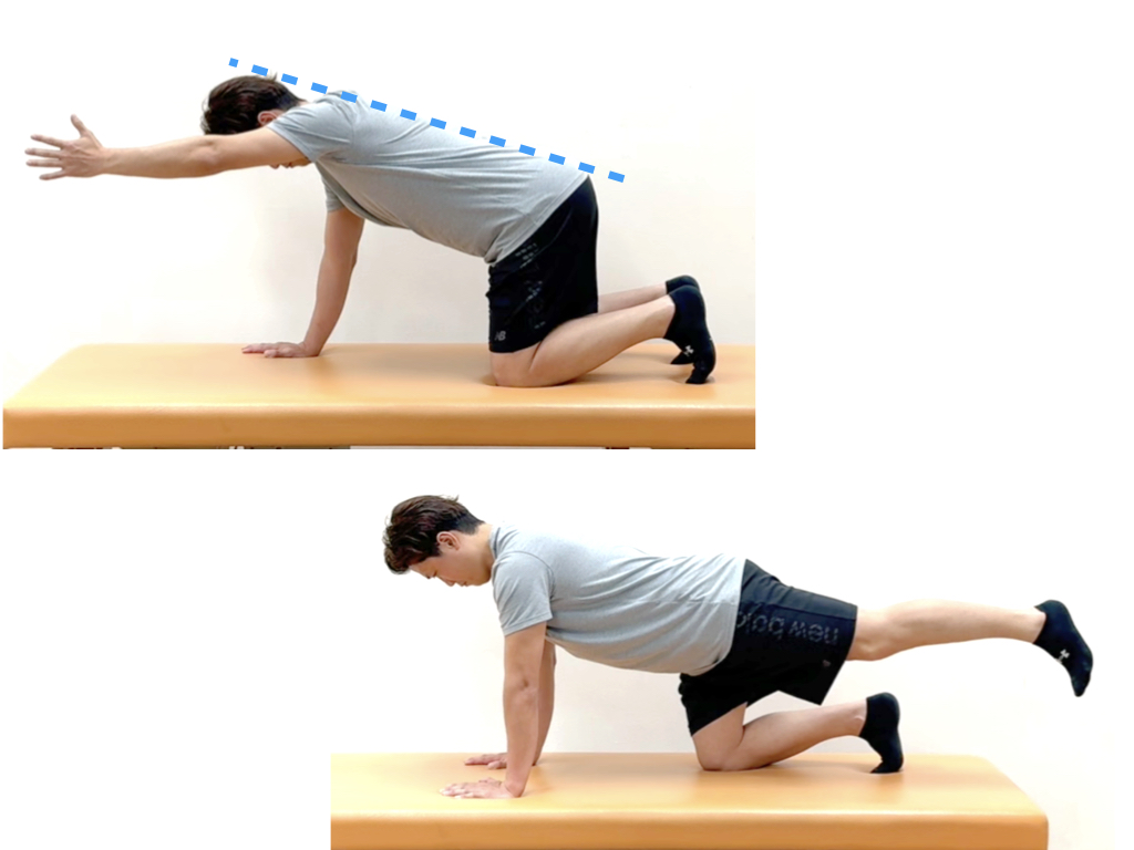 - 四つばい、頭と背中を一直線、腰椎中間位(ニュートラル)とする。