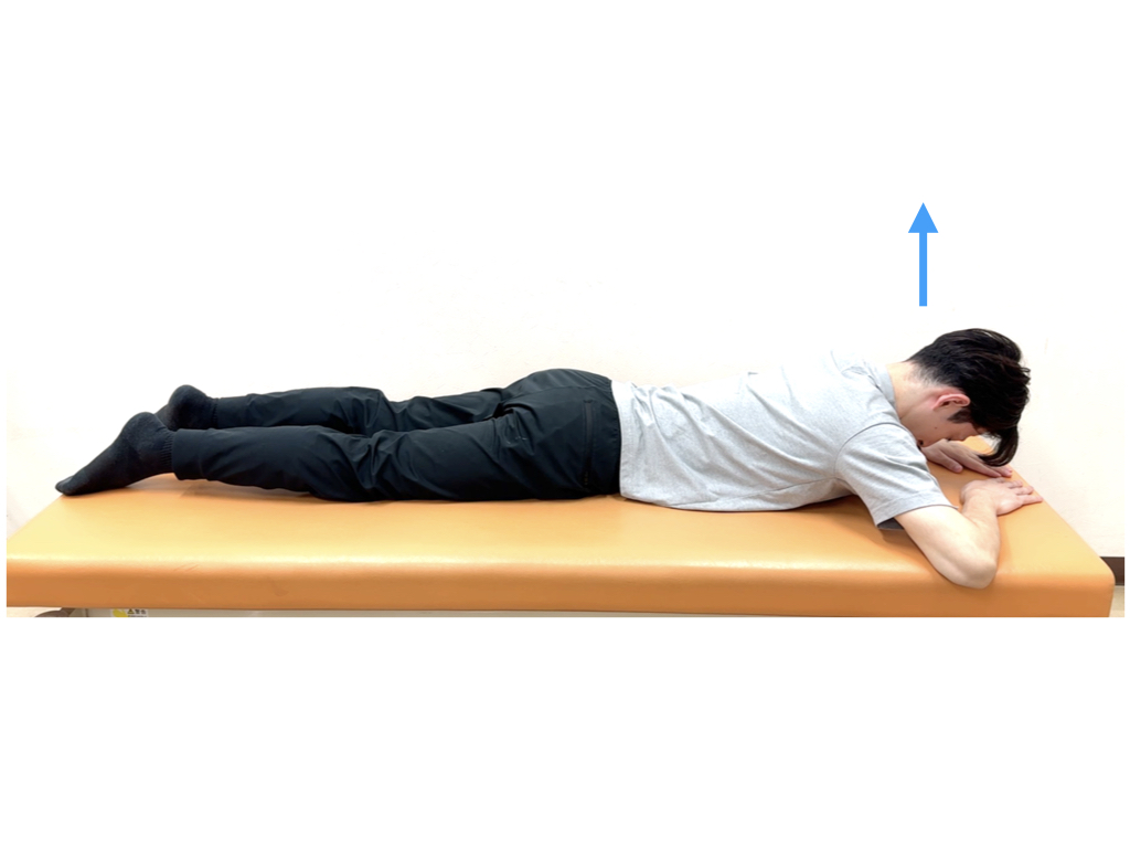- 首の下(第7頚椎)を軸にして、頭を天井方向に持ち上げ、5〜10秒止める。