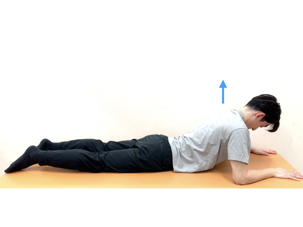 - お腹に力を入れて、頭・上部体幹を天井方向に持ち上げ、頭と背中を一直線にして5〜10秒止める。