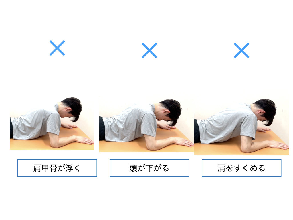 肩甲骨が浮かない、肩をすくめない、頭が下がらないように注意する。