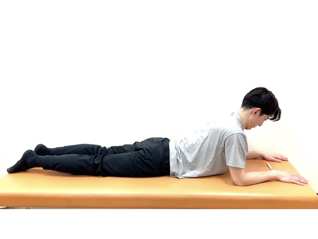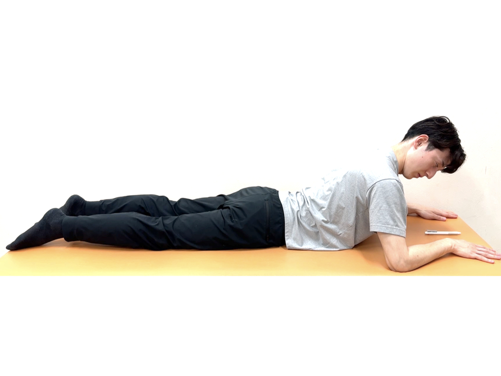 - うつぶせ、顔の横に肘、手のひらをつける。