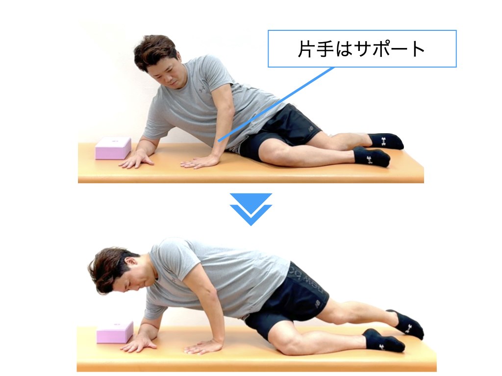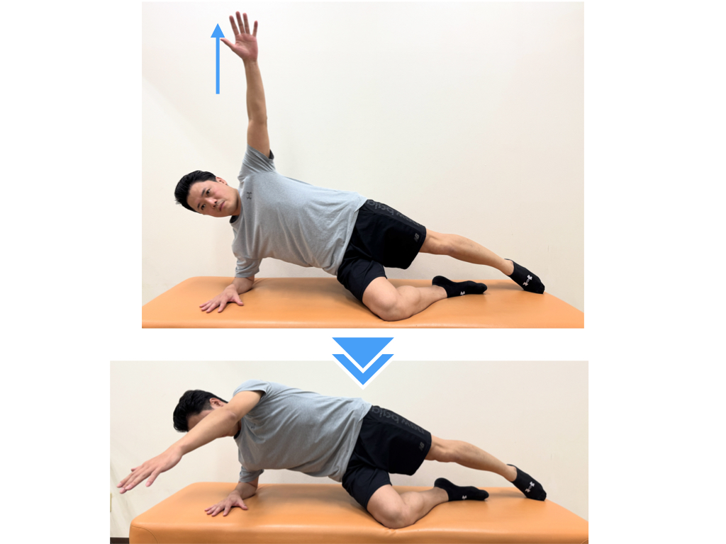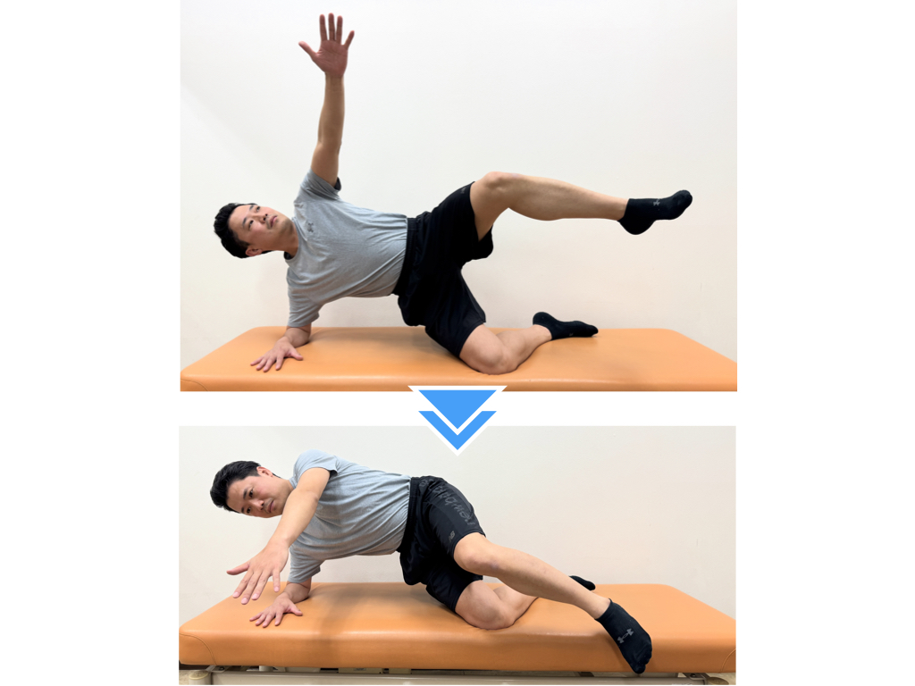 - 胸椎を回旋させながら天井方向に向かって片手を伸ばす。支持している肩が前に動きすぎないように注意する。