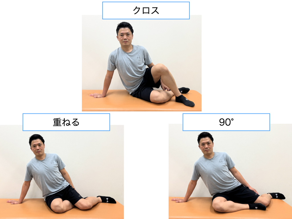 - 横向き、肩の下に肘を置き、股関節と膝関節を曲げる。