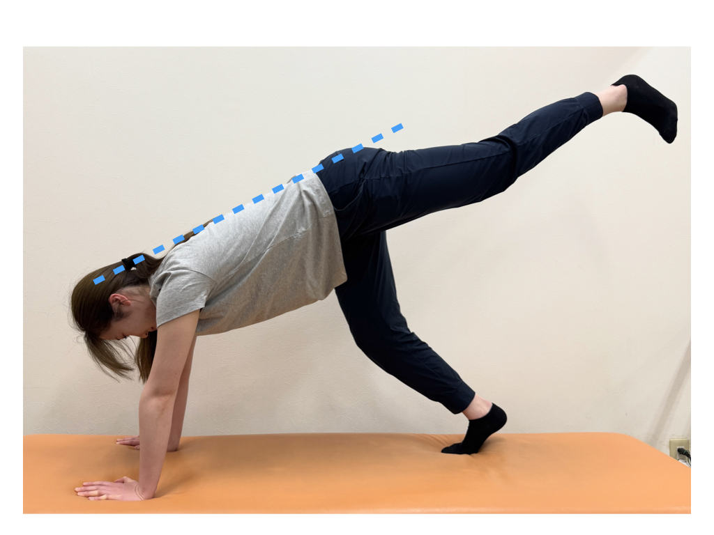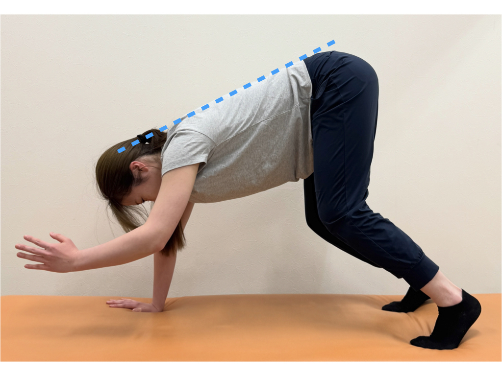 お尻を斜め後ろに上げて(肩よりもお尻が高い)、頭・背中を一直線にする。