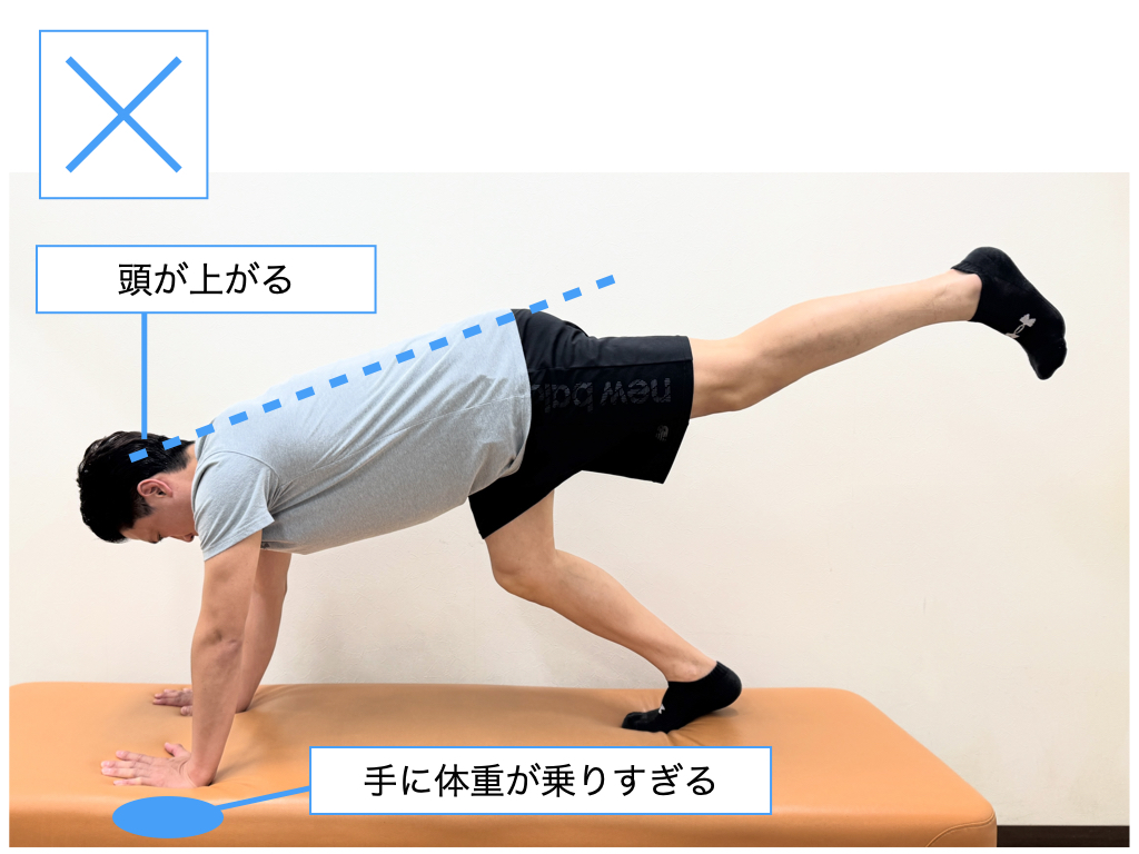 頭が下がらない、肩甲骨が浮かないように注意する。