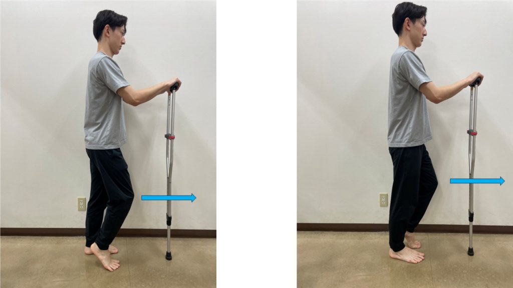- 立位にて、必要に応じて松葉杖などを支えとして使う。