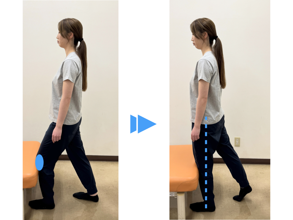 膝が曲がらない、身体が回らないように注意しましょう。体重が乗る前に膝が伸びしてしまうと、お尻が後方になってしまうので注意しましょう。