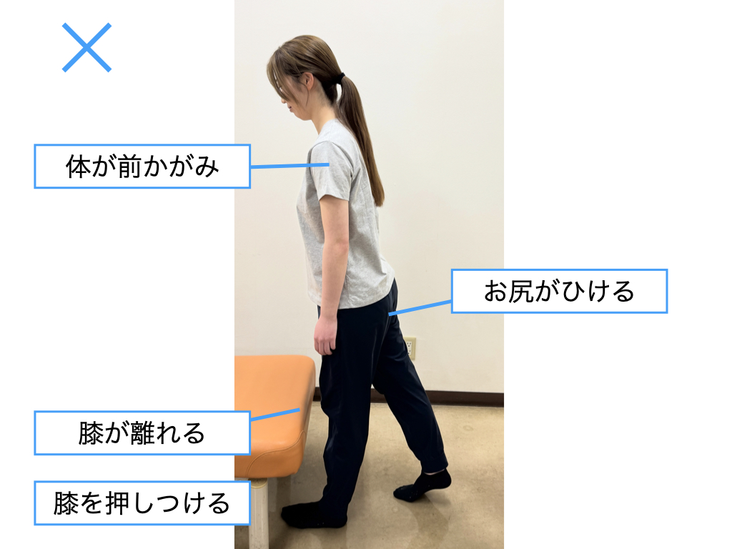 荷重時にお尻が足より後にならない(腰が引ける)、骨盤が横にシフトしないよう注意しましょう。