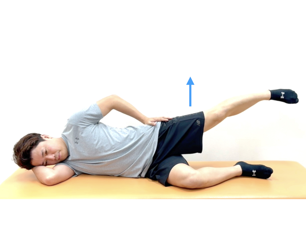 2. 膝のお皿を正面に向け、膝を伸ばした下側の下肢を天井方向に上げる。