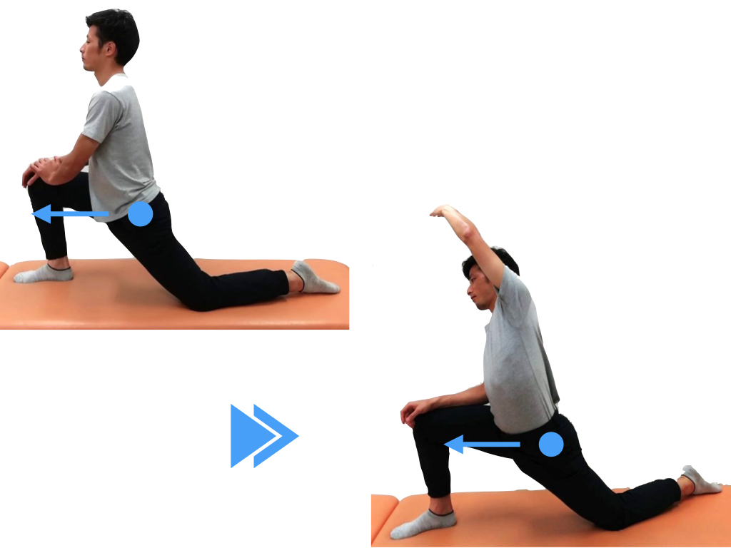 - 胸椎を回旋させながら天井方向に向かって片手を伸ばす。