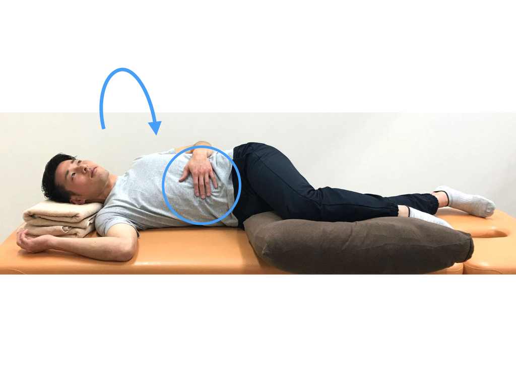 - 横向き、手を頭またはお腹に置く。上側の足をクッションなどに乗せて骨盤を安定させても良い。